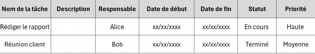 Créez un tableau de suivi des tâches pour gérer les responsabilités et les échéances. Utilisez des colonnes pour :